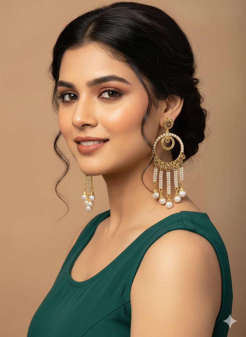 Elevate your ethnic ensemble with these exquisite, grand statement earrings. Featuring a rich antique gold finish, intricate stone embellishments (Kundan/CZ), and cascading faux pearl drops, these Jhoomar-style danglers are the perfect accessory for weddings, festivals, and all heavy traditional occasions.
