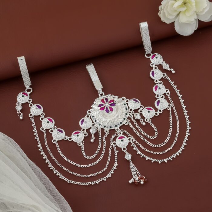 Be the first to review “Antique Silver Plated Multi-Chain Kamarbandh with Kempu Stones kgm brand” Cancel reply