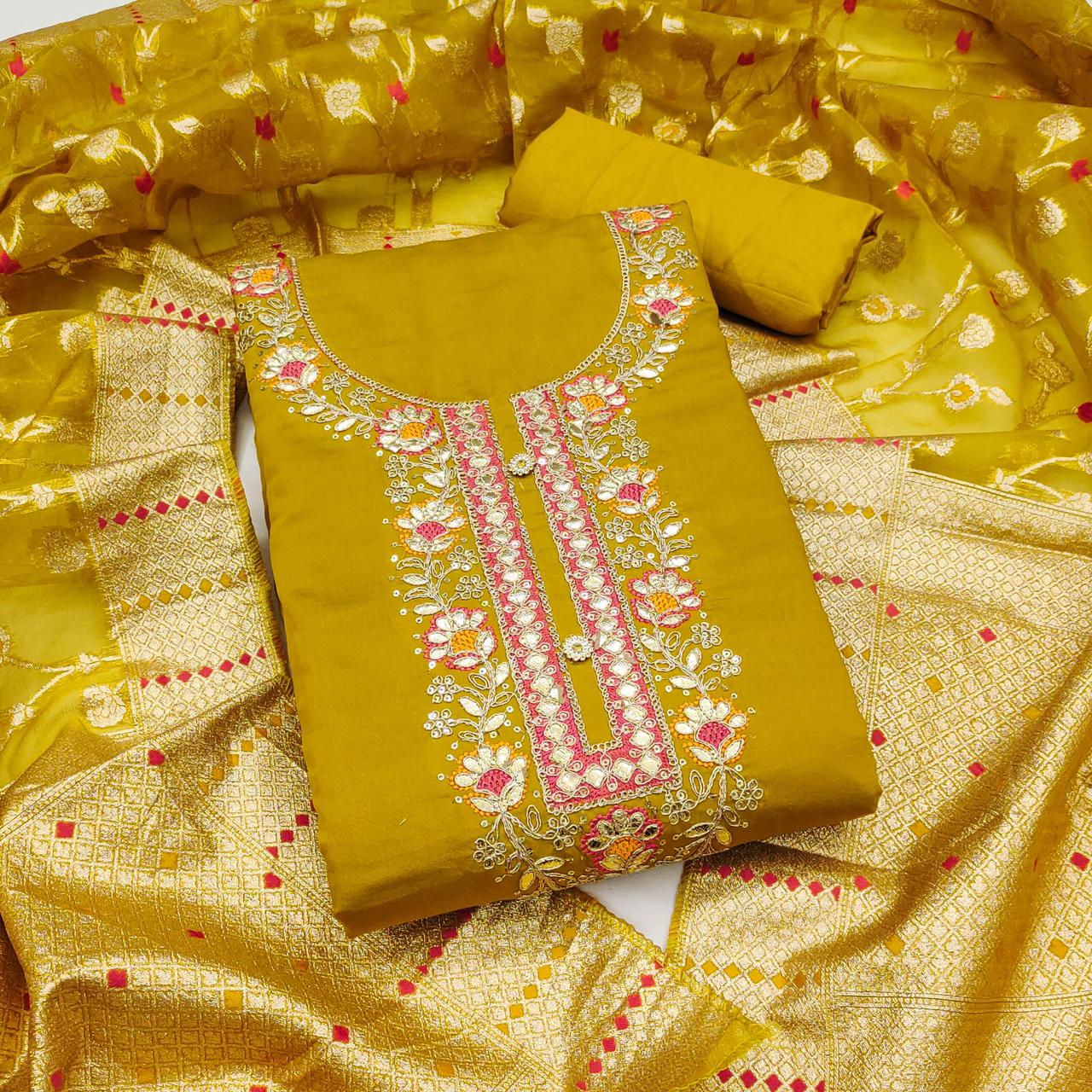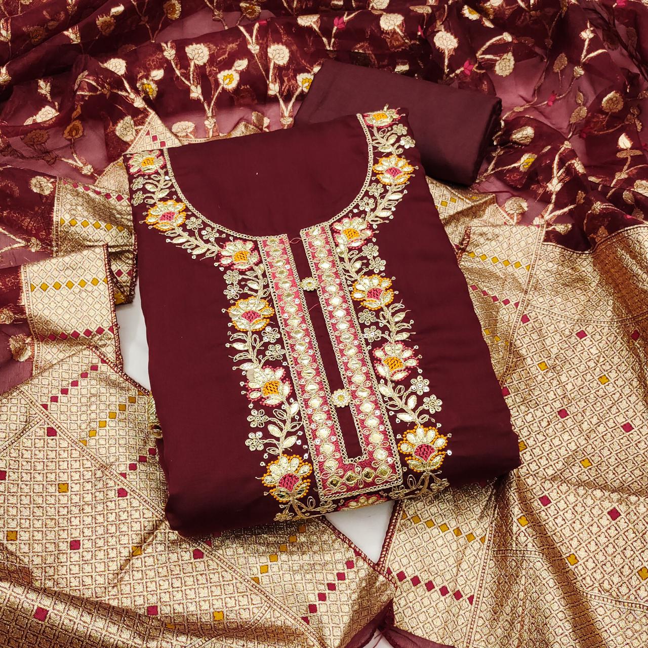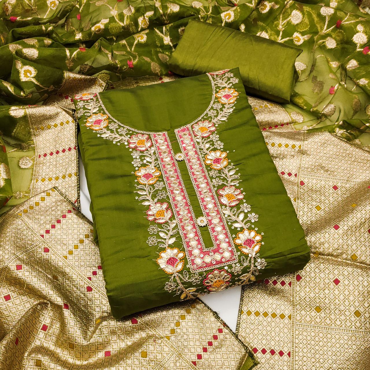 Heavy Gold Embroidered Roman Silk Dress Material with Jequard Woven Dupatta | Unstitched Party Wear Suit Set kgm brand