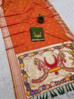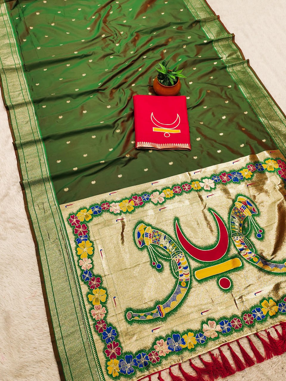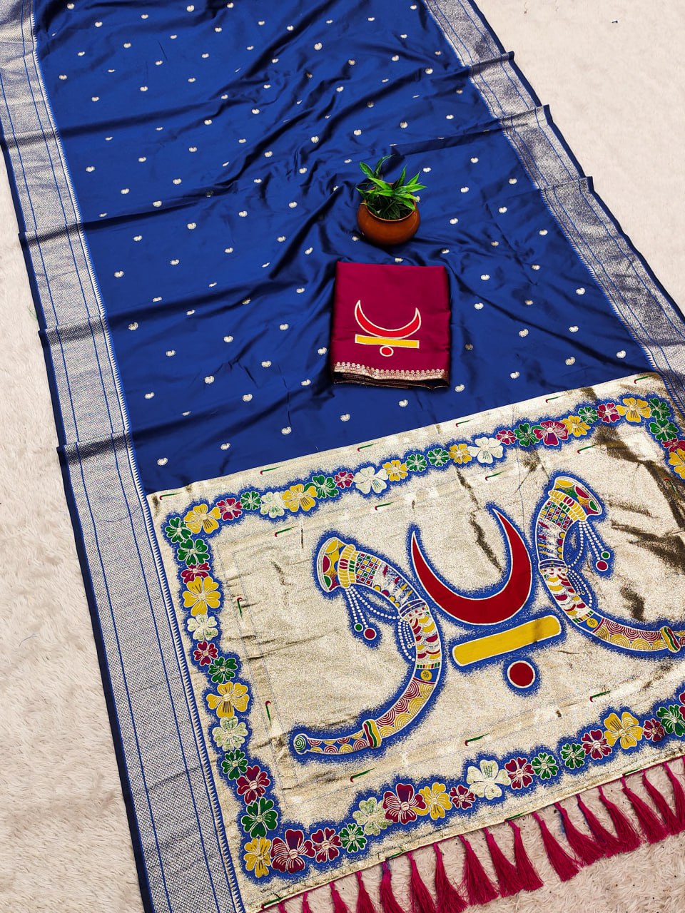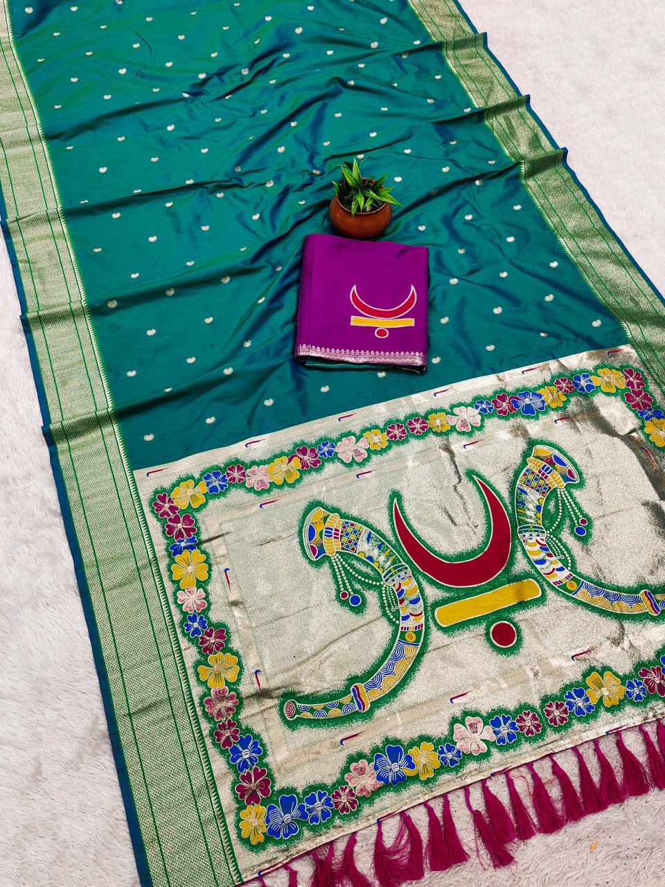 Saree :- Soft Pethani silk saree with zari weawing motifs design all over the saree and Meenakari weawing Rich pallu with kadiyal weawing border & Tassels attached at Pallu end.