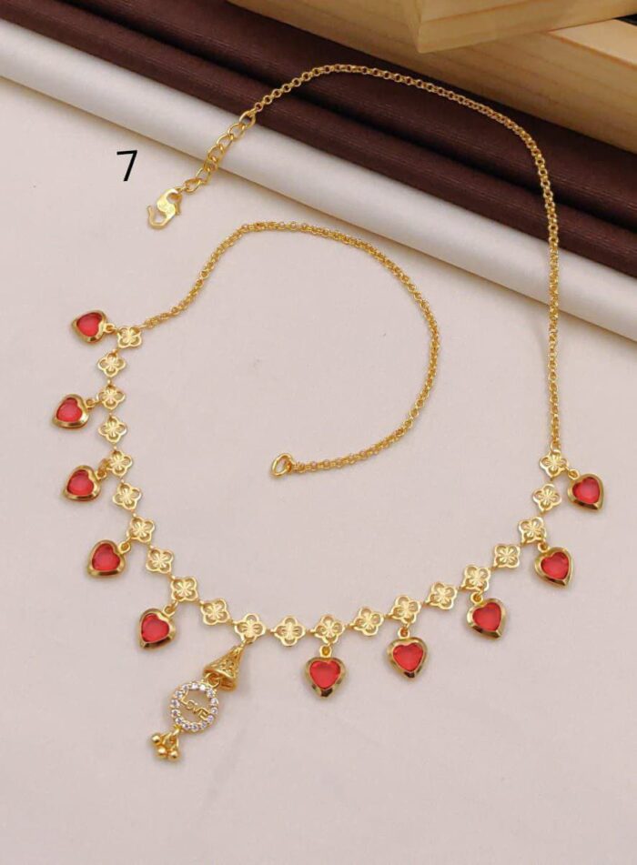 Add a touch of timeless elegance to your look with this stunning gold-plated necklace. Featuring delicate floral motifs and charming ruby-red heart-shaped pendants, this piece is perfect for festive occasions, weddings, or as a thoughtful gift. The adjustable chain ensures a perfect fit for any neckline.
