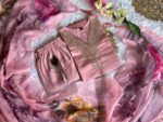 Introducing the “Light Peach Bloom Set”! This New Designer Kurti Pent Dupatta Set features a soft Roman Silk Kurti with heavy sequence and thread embroidery on the neckline. It is paired with matching Roman Silk pants and a stunning Chanderi Silk Dupatta boasting a vibrant digital floral print. Perfect for party wear, festive occasions, or a glamorous evening event.