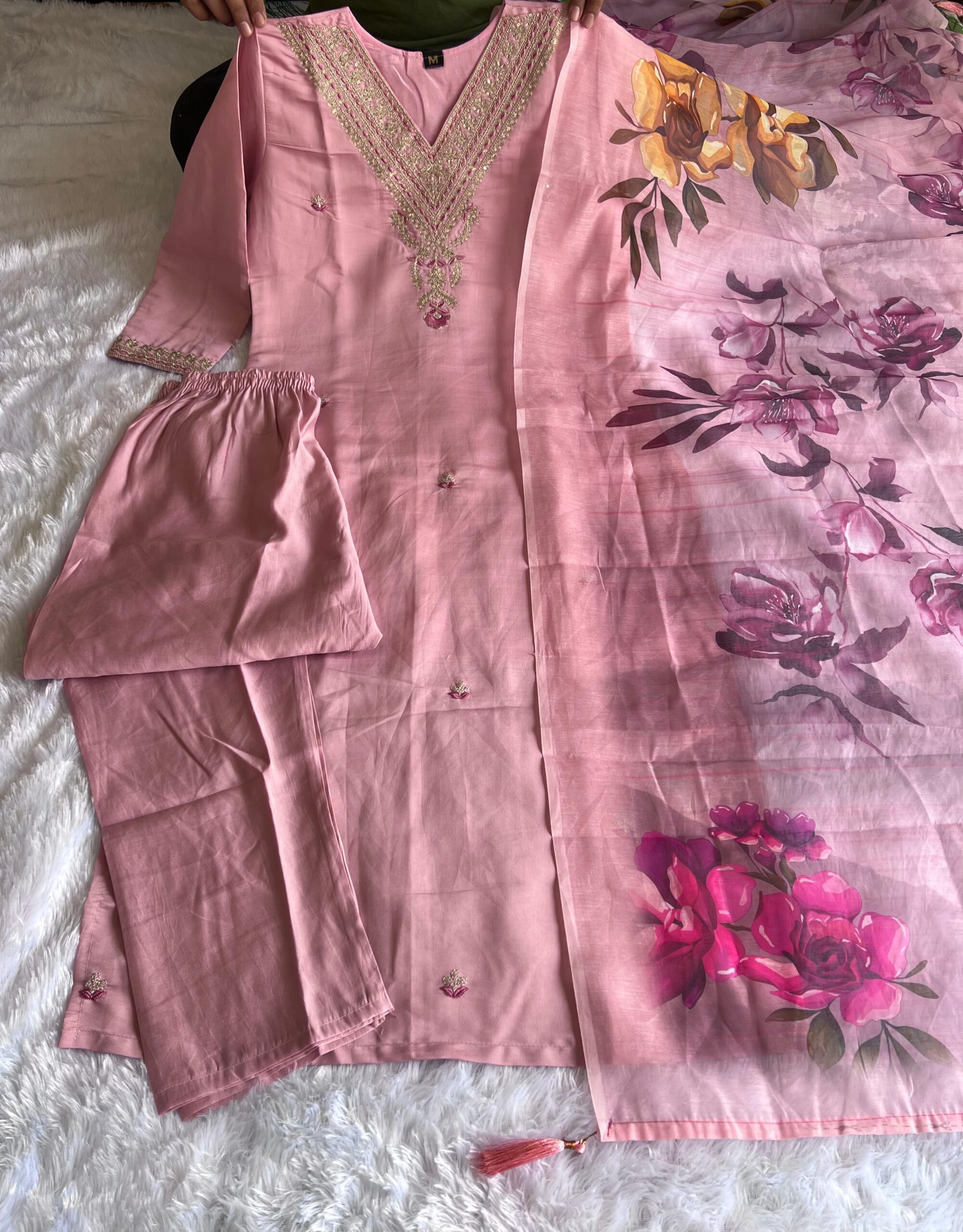 Introducing the “Light Peach Bloom Set”! This New Designer Kurti Pent Dupatta Set features a soft Roman Silk Kurti with heavy sequence and thread embroidery on the neckline. It is paired with matching Roman Silk pants and a stunning Chanderi Silk Dupatta boasting a vibrant digital floral print. Perfect for party wear, festive occasions, or a glamorous evening event.