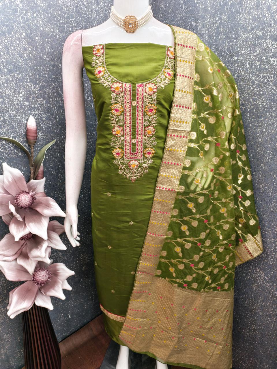 Festive Roman Silk Dress Material – Embroidered Neckline and Banarasi Dupatta kgm brand
