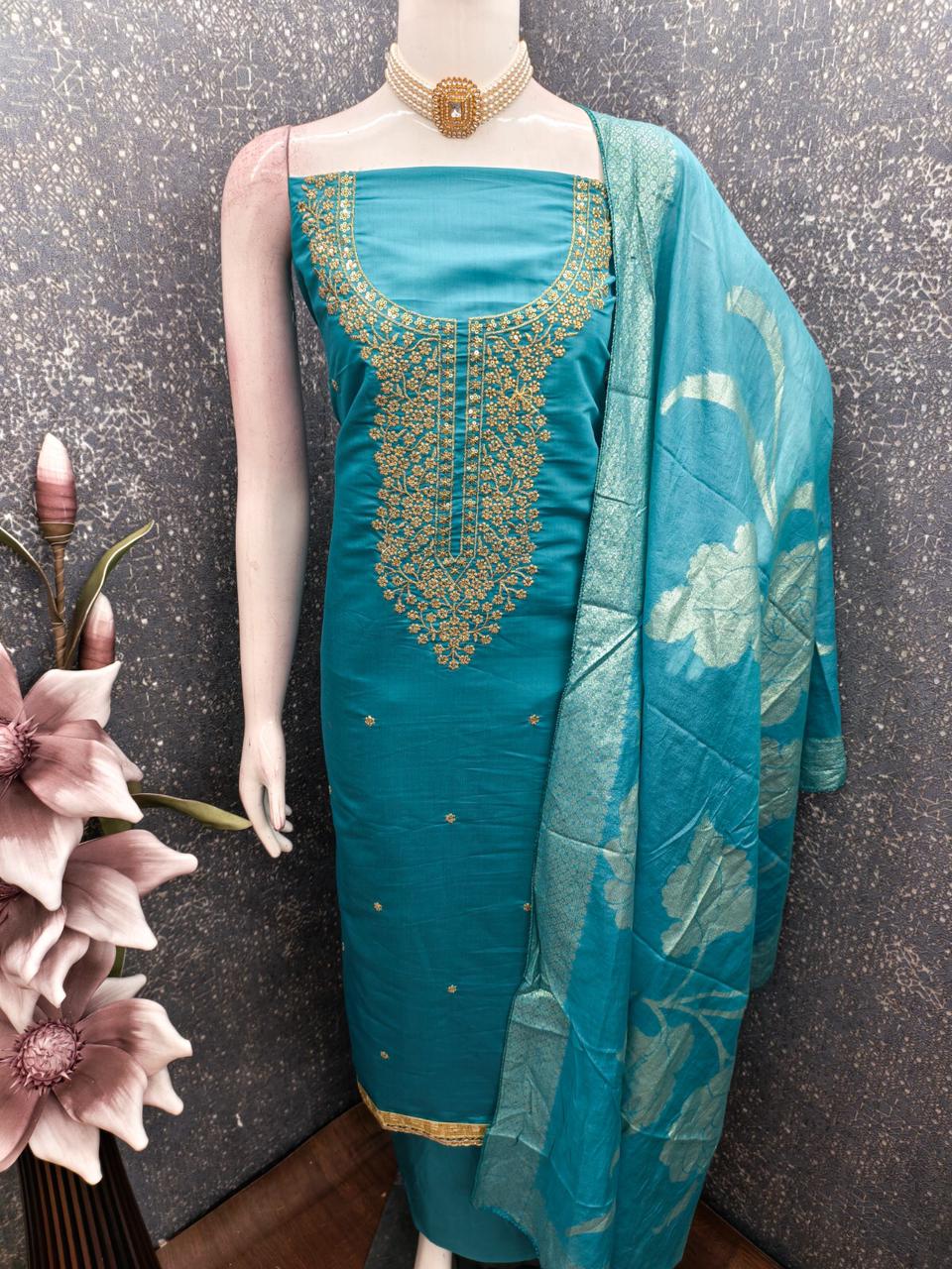 Festive Roman Silk Dress Material - Embroidered Neckline and Banarasi Dupatta kgm brand