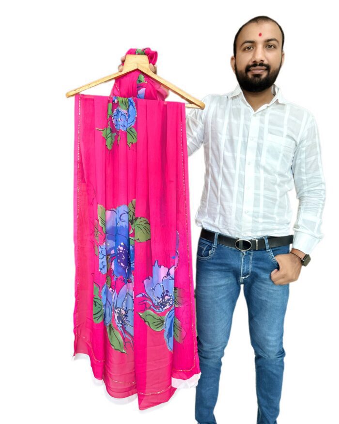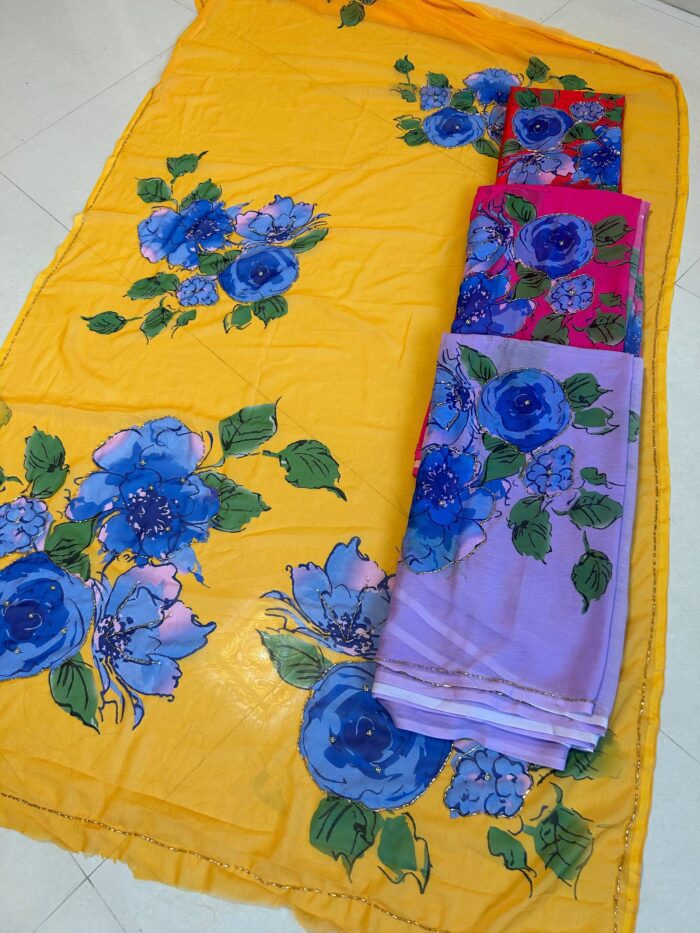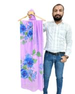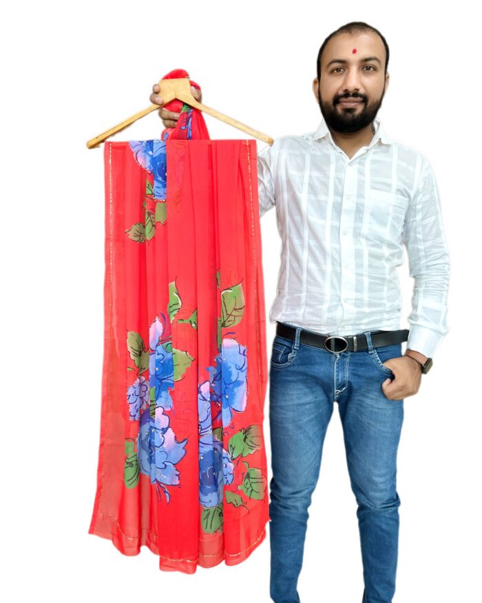 Crafted from a premium “weightless” fabric (typically a high-quality georgette or chiffon), it drapes effortlessly, giving you an ethereal and graceful silhouette. The entire body of the saree is adorned with a vibrant and beautiful digital print, featuring intricate floral or other elegant motifs.
