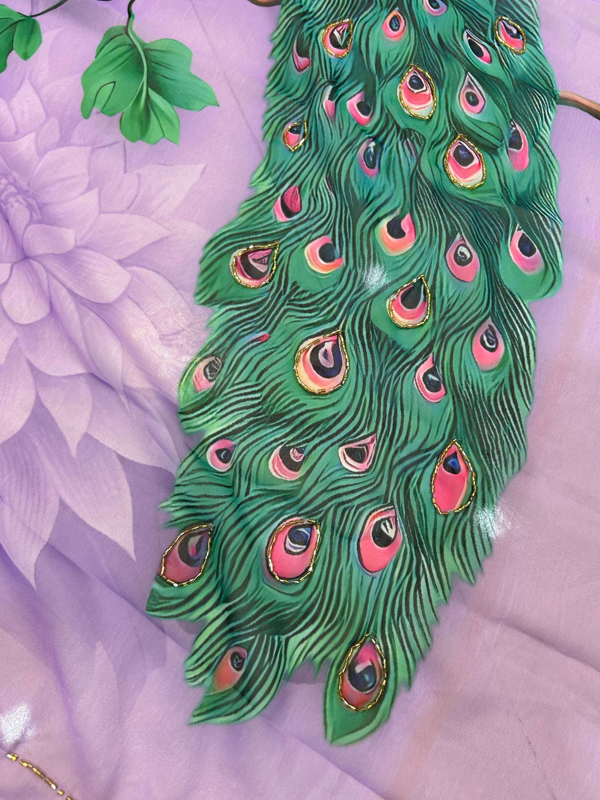 Home » Shop » Printed Sarees » hand work val and peacock design, weightless print saree kgm brand
