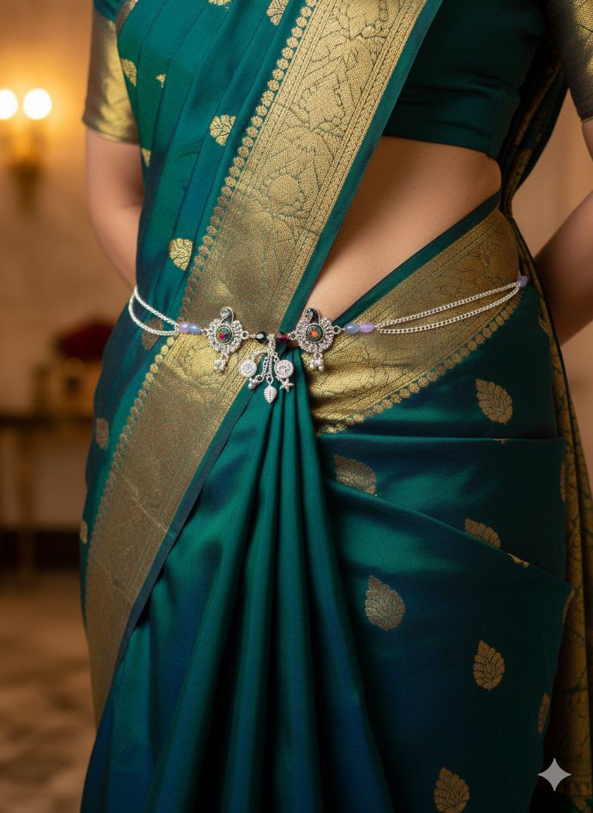 Adorn your traditional attire with this stunning Silver-Toned Kamarbandh. Featuring intricate multi-chain detailing, a classic central motif, and beautiful red, white, and green gemstone embellishments. Perfect for sarees, lehengas, and ethnic wear.