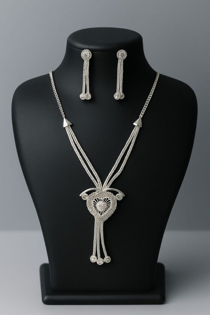 - Intricate Design: The set features a stunning heart-shaped pendant with intricate filigree (jali) work, a delicate double-chain design, and matching dangle earrings. The detailed craftsmanship highlights its classic, ethnic appeal.