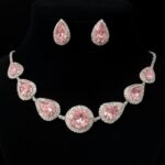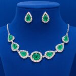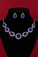 Step into the spotlight with this exquisite necklace and earring set from KGM Brand. Featuring stunning teardrop and round-cut American Diamond (AD) stones surrounded by a halo of micro-pave diamonds, this silver-plated set is a masterpiece of craftsmanship. Perfect for weddings, reception parties, or any grand celebration.