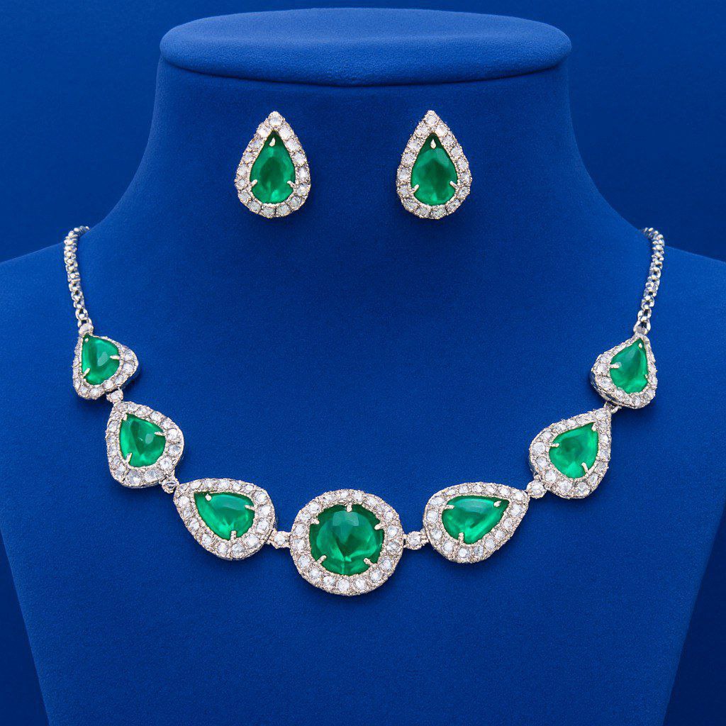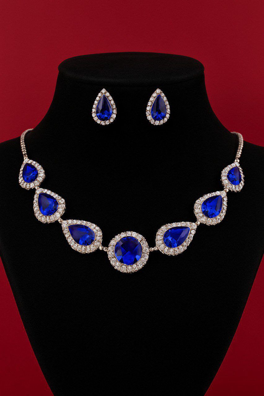 Step into the spotlight with this exquisite necklace and earring set from KGM Brand. Featuring stunning teardrop and round-cut American Diamond (AD) stones surrounded by a halo of micro-pave diamonds, this silver-plated set is a masterpiece of craftsmanship. Perfect for weddings, reception parties, or any grand celebration.