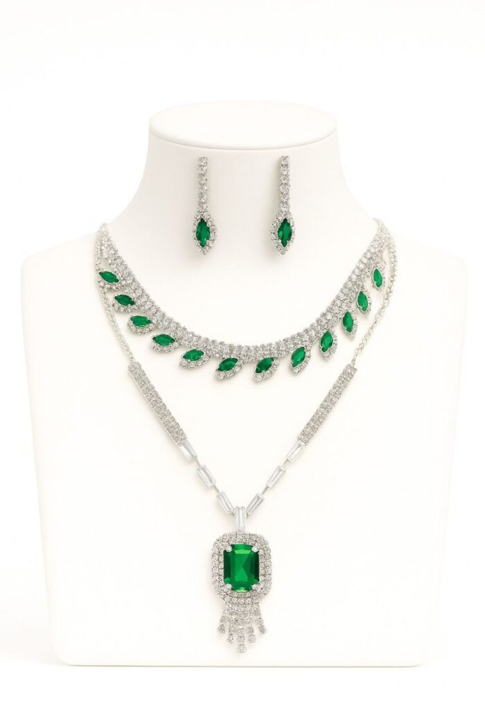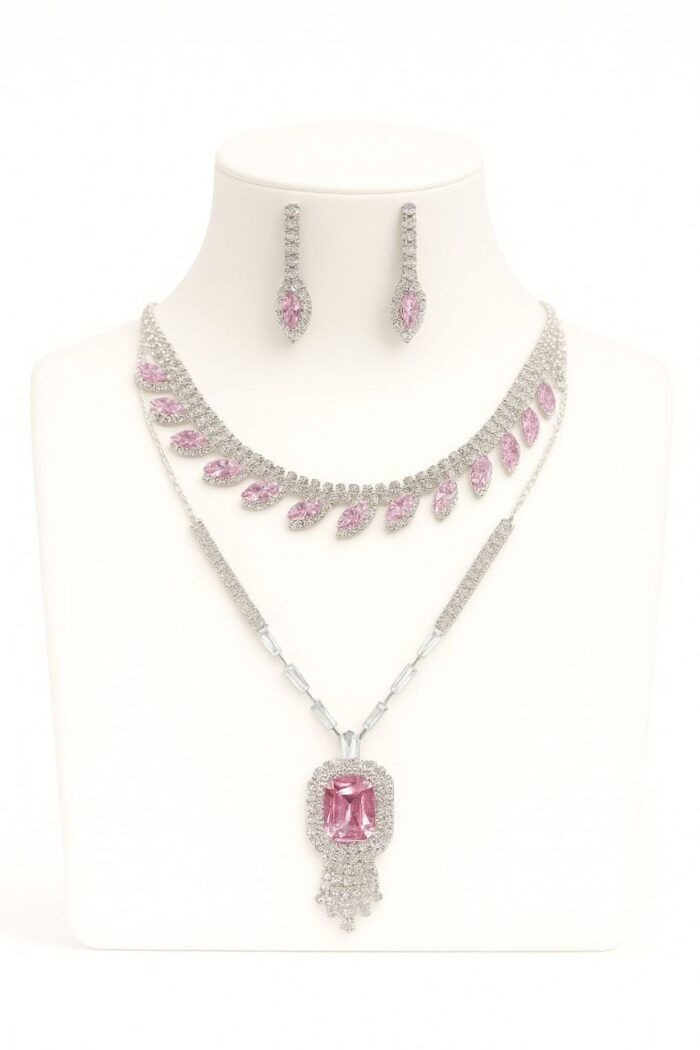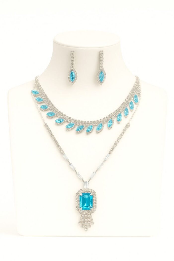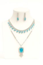 Make a statement of unparalleled elegance with this exquisite two-layer necklace and earring set from KGM Brand. This sophisticated jewelry set is a perfect blend of modern design and timeless glamour, making it an ideal accessory for special occasions.