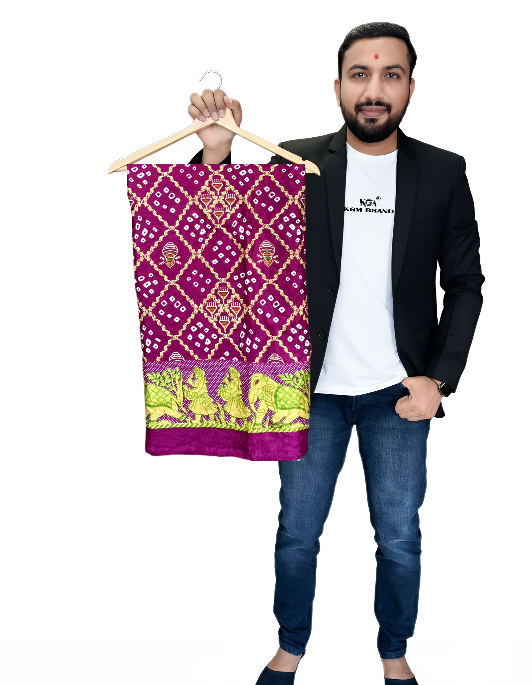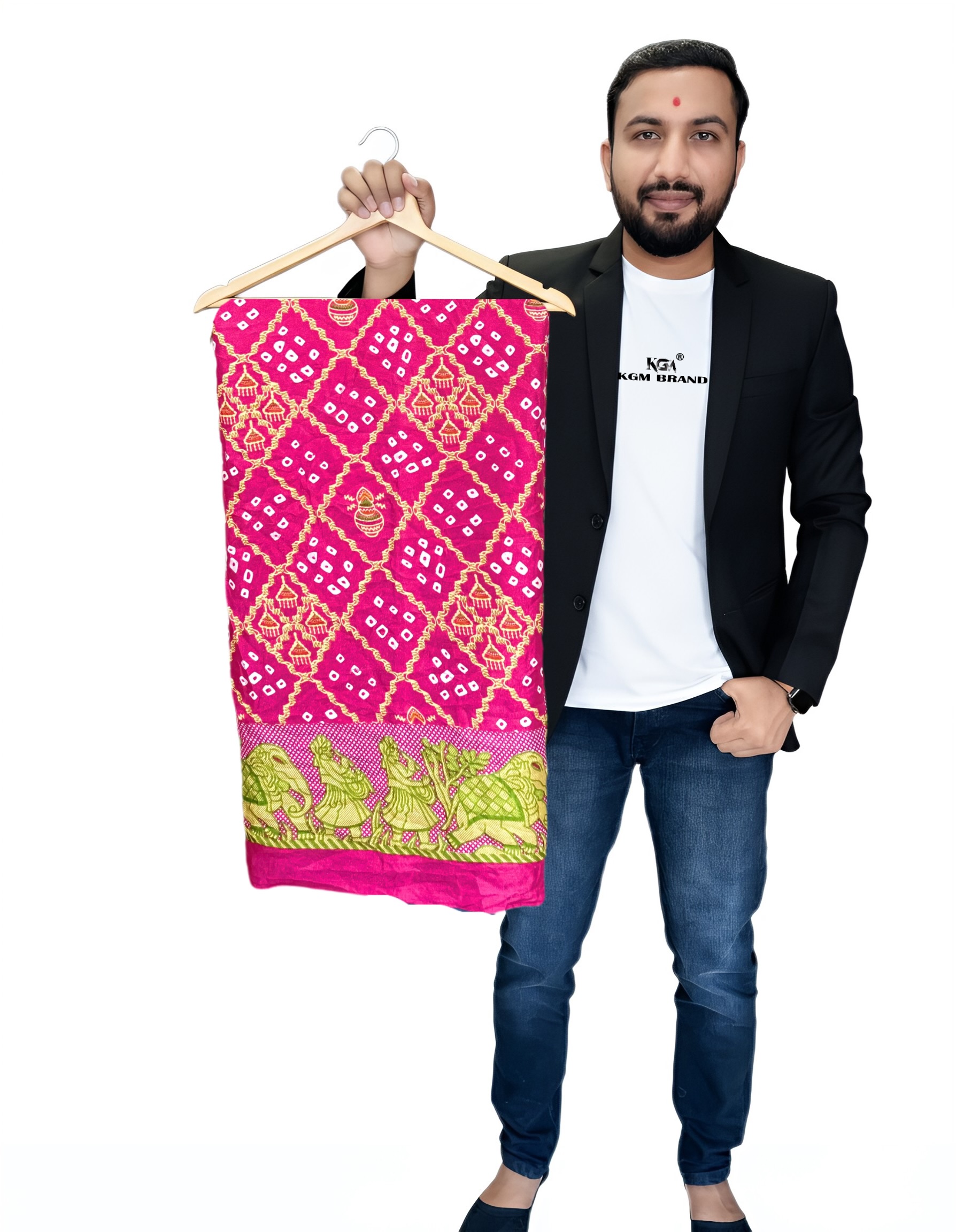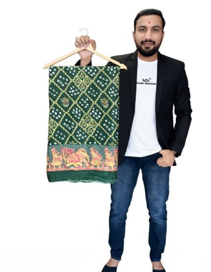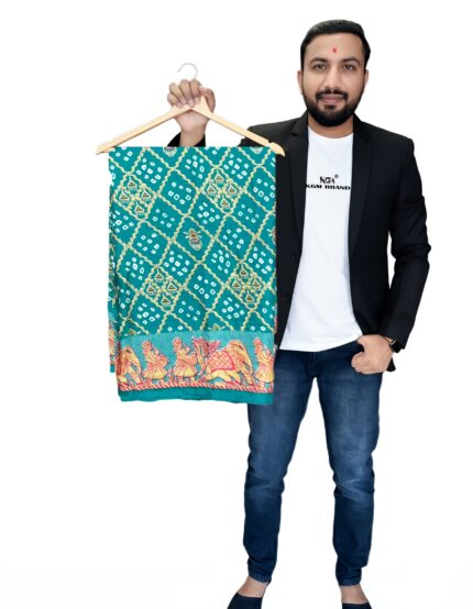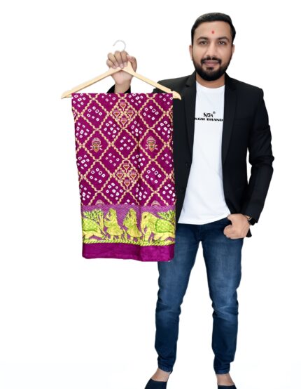 Step out in traditional elegance with this stunning KGM brand pure silk Bandhani saree. Handcrafted with the classic tie-and-dye technique, the saree features a beautiful all-over pattern. The highlight of this piece is the intricate Jaipuri art border, depicting a vibrant scene with elephants and traditional motifs. The pallu is a rich contrast with bold stripes and intricate detailing. Made from high-quality silk, this saree drapes beautifully and is perfect for weddings, festivals, and special occasions. Available in multiple vibrant colors including [list the colors from the images: e.g., Fuchsia Pink, Emerald Green, Royal Purple, Maroon Red, Teal Blue].