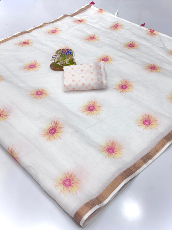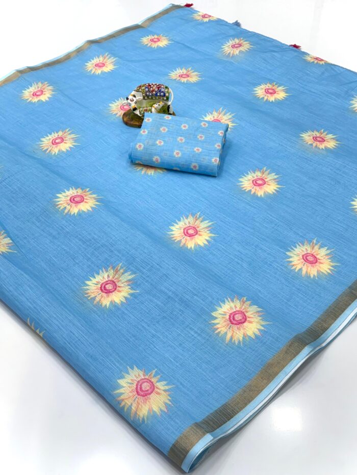 Sky Blue Pure Linen Cotton Saree with Blouse, Pista & Orange Accents – Printed with Jari Border | kgm brand – WHITE