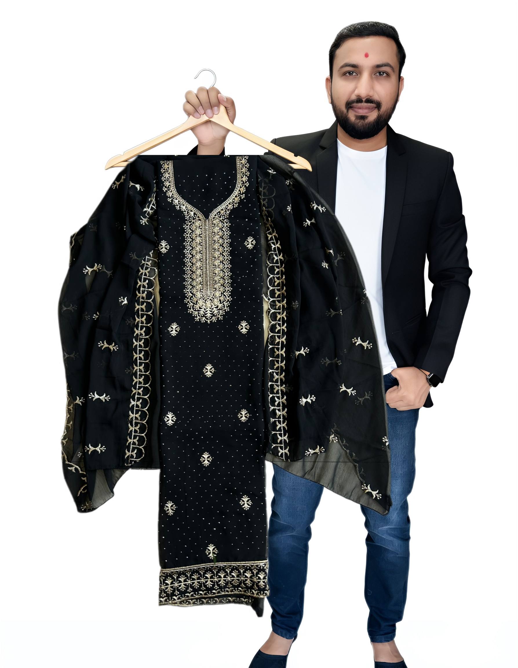Home » Shop » Unstitched Dress Material » Luxurious Georgette Zari Work Salwar Suit with Zig-Zag Embroidery & Crape Bottom kgm brand