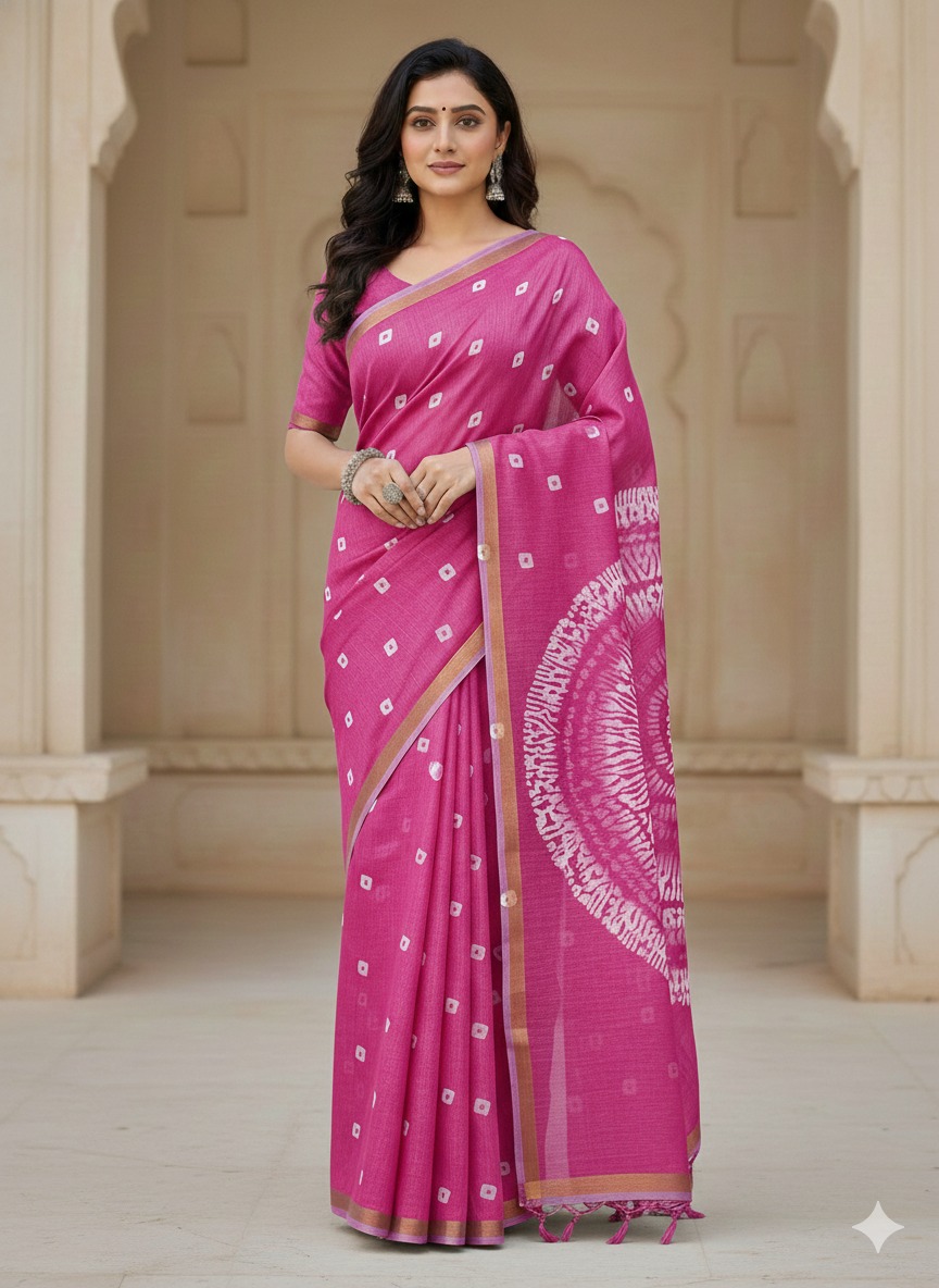 Home » Shop » Printed Sarees » New Collection Lightweight Bandhani Saree in Smooth Linen Fabric | Rich Flower Pallu & Digital Bandhej Blouse| festiv and party wear | kgm brand