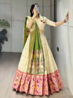 Presenting the richness of Maharashtrian heritage, this exquisite Paithani silk lehenga features vibrant woven Colorful motifs and an iconic gold zari border With Iconic Dupatta.👜