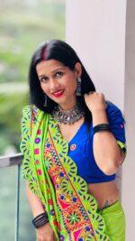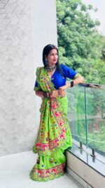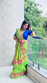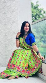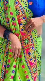 step into the spotlight with this stunning, traditional saree featuring intricate Gamthi Handwork, a signature folk-art embroidery of Gujarat. Perfect for adding a burst of color and authentic cultural charm to Navratri Dandiya, Mehendi ceremonies, or any Wedding function.