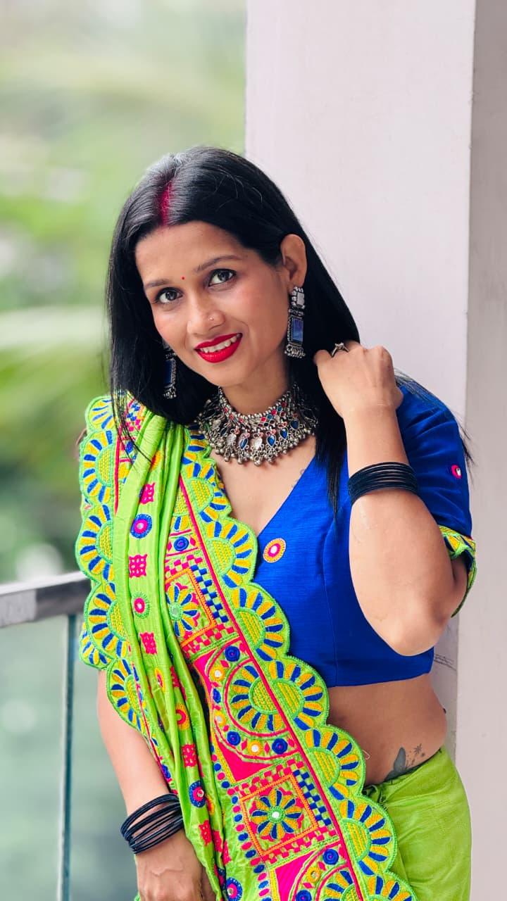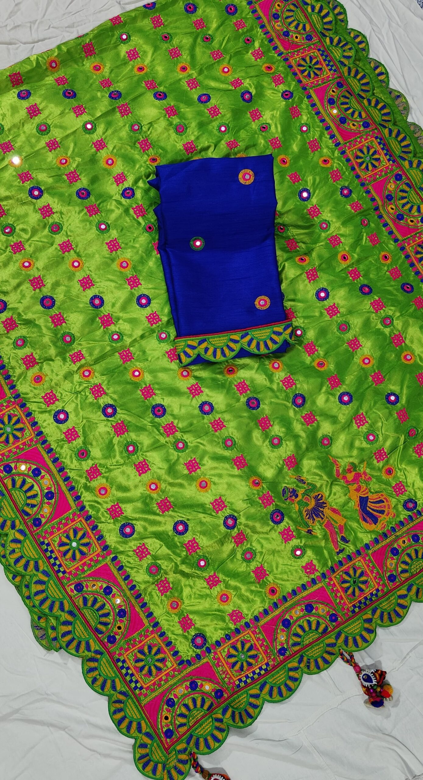 step into the spotlight with this stunning, traditional saree featuring intricate Gamthi Handwork, a signature folk-art embroidery of Gujarat. Perfect for adding a burst of color and authentic cultural charm to Navratri Dandiya, Mehendi ceremonies, or any Wedding function.