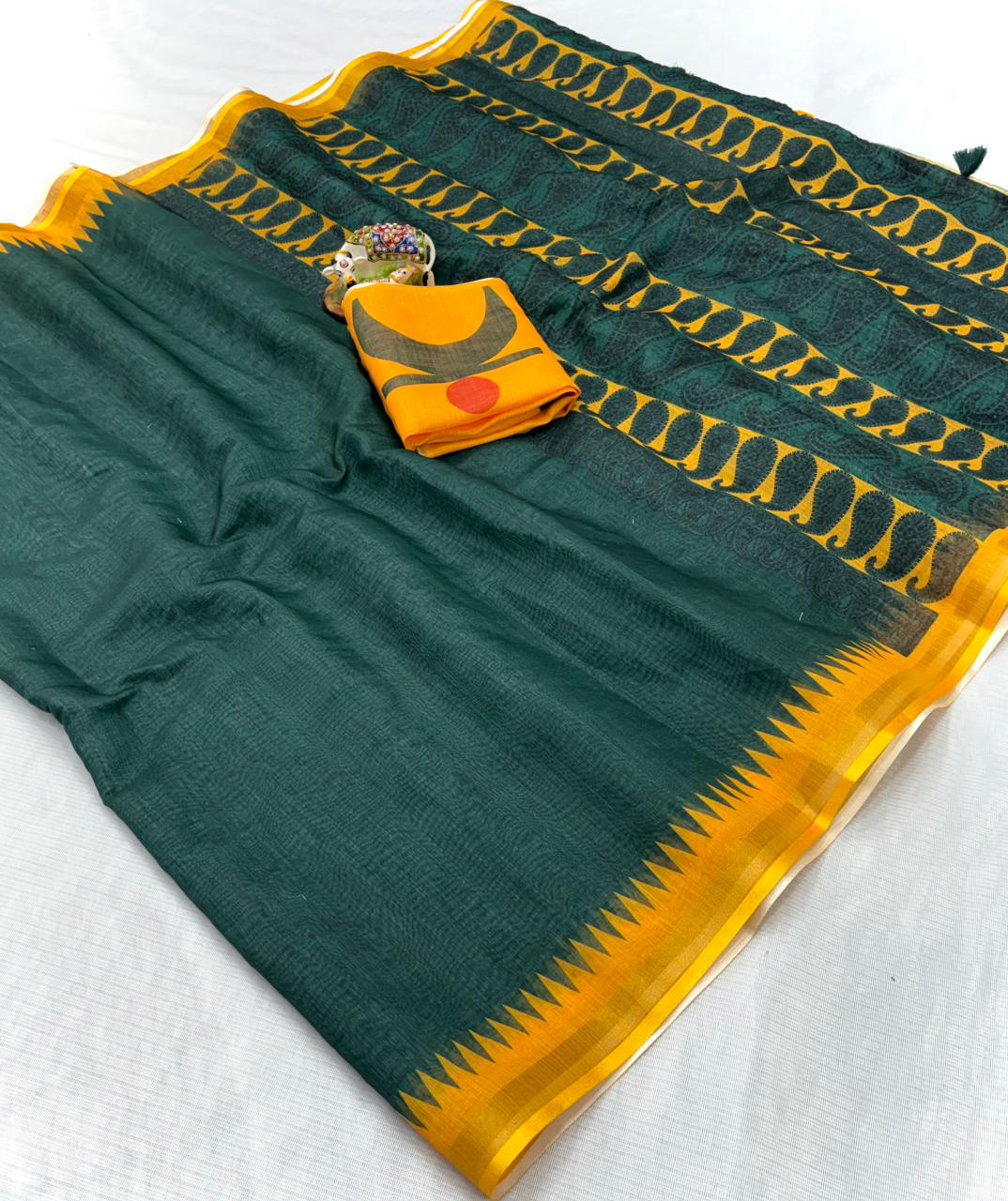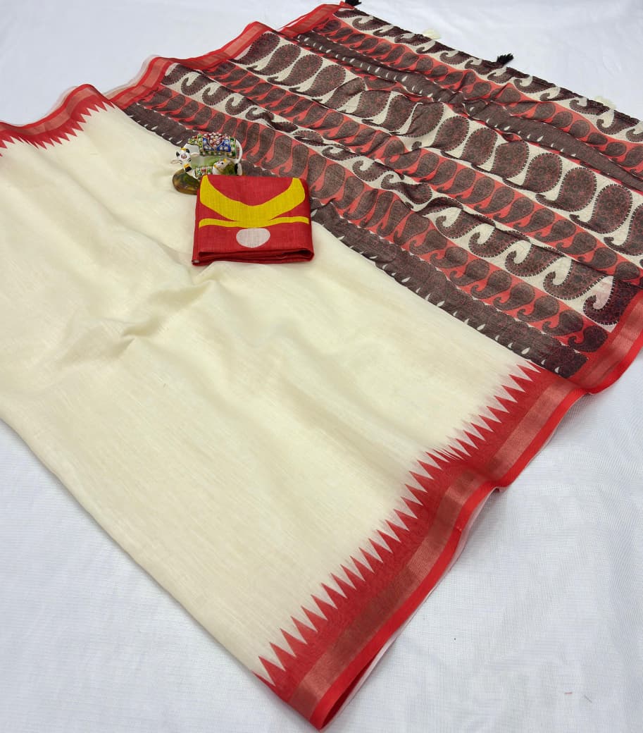 Premium Linen Cotton Saree with Rich Kalamkari Print Border and Striped Blouse Kgm Brand