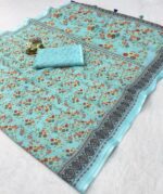 Linen Cotton Sarees with Blouse – Pista, Blue, Sky Blue, Black, Pink