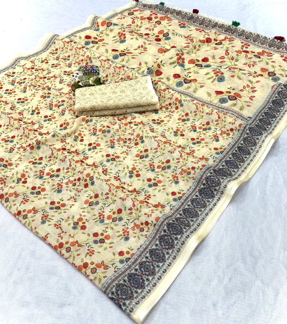 Linen Cotton Sarees with Blouse – Pista, Blue, Sky Blue, Black, Pink – CREAM
