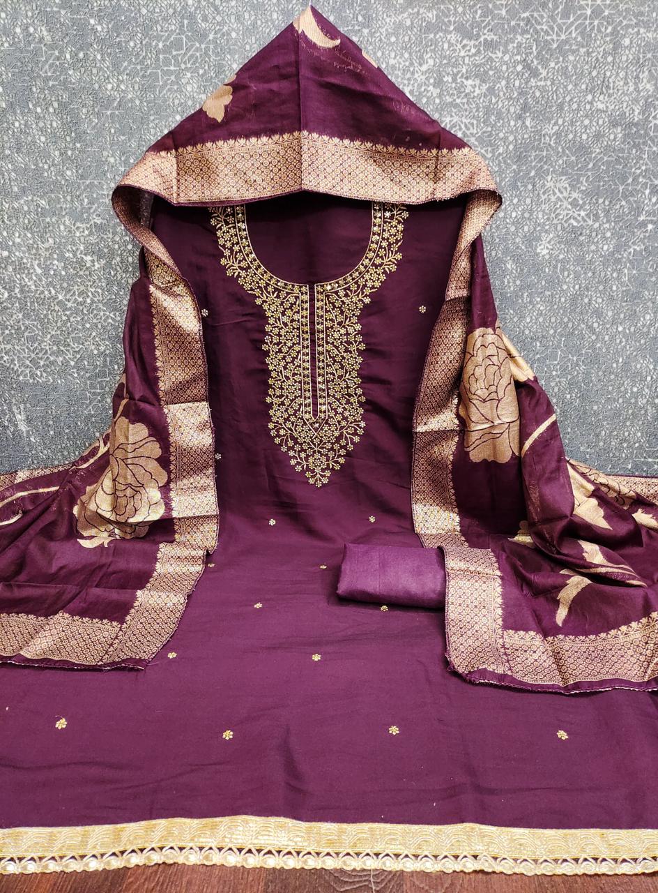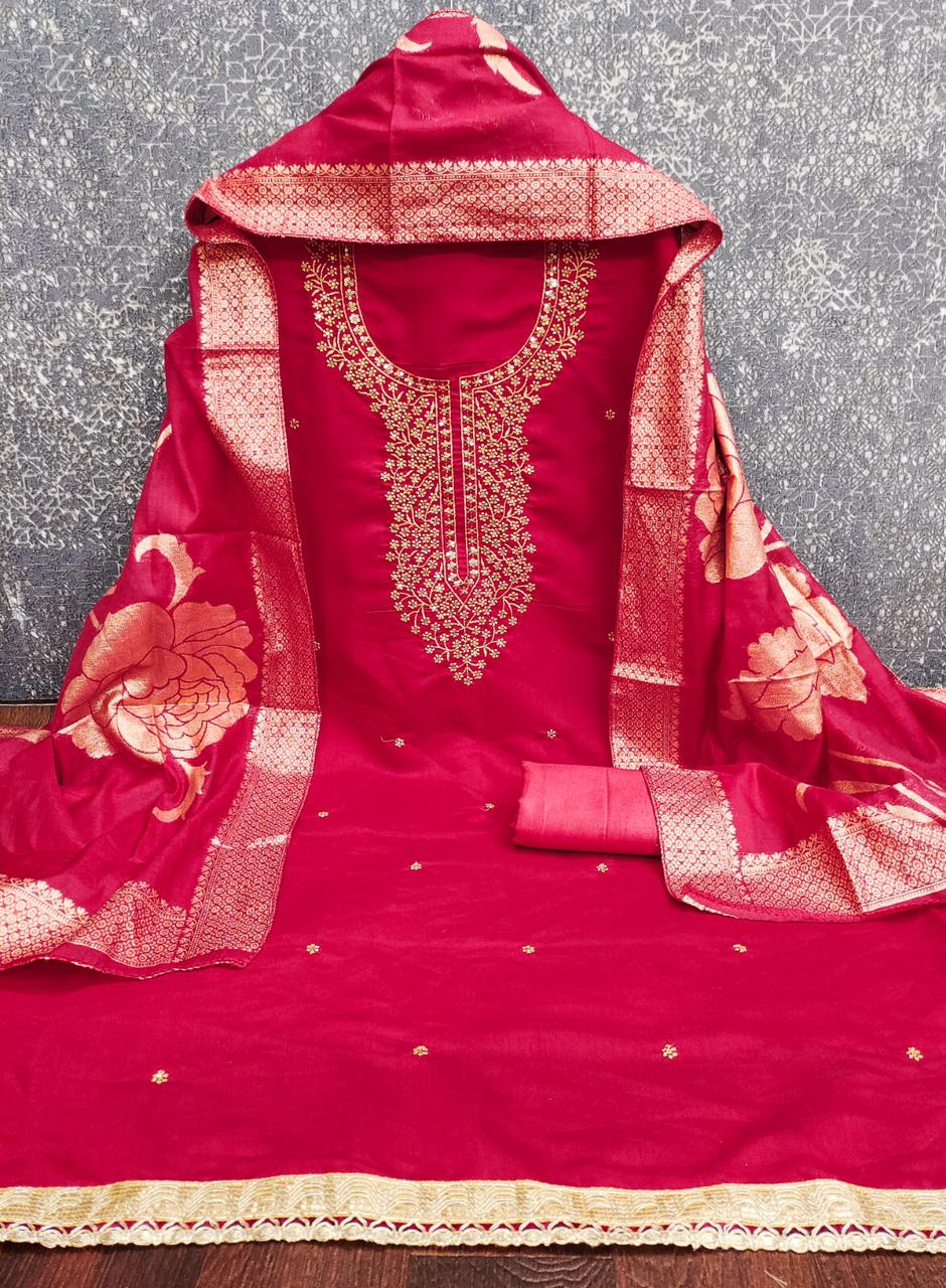 Premium Roman Silk Suit with Heavy Embroidery & Woven Silk Dupatta (Unstitched) kgm brand