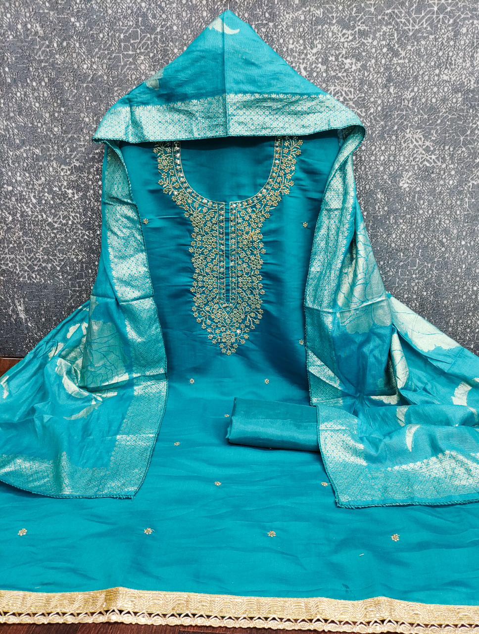 ComponentFabric & WorkSpecificationsAppealTop (Kurta/Kameez)ROMAN SILK with Codding WorkLength: 1.9 Mtrs (Unstitched). Densely decorated with heavy multi-thread, zari, and sometimes sequence/mirror work along the neckline and central panel.Smooth drape, rich feel, and high-impact design for the festive look.Bottom (Salwar/Pants)INDIAN SANTOON (Solid)Length: 2.2 Mtrs (Unstitched). Plain fabric matching the top’s base color.Sturdy, comfortable, and versatile for tailoring into Salwar, Churidar, or Palazzo.Dupatta (Scarf)JEQUARD (Heavy Woven)Length: 2.10 Mtrs. Features rich, all-over golden or matching Zari weaving in floral/geometric patterns.Luxurious finish, excellent volume, and adds a dazzling traditional contrast.
