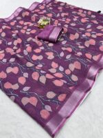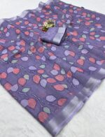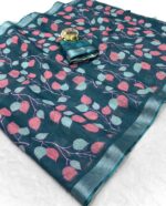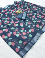 Be the first to review “Pure Linen Cotton Saree with Leaf Print and Silver Zari Border With Blouse Piece Kgm Brand” Cancel reply