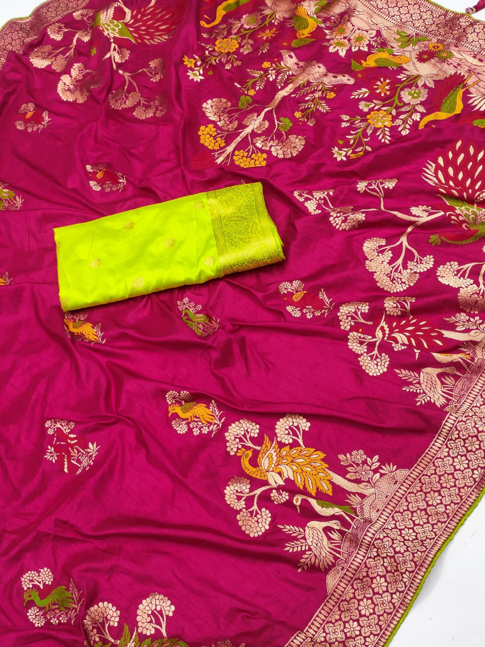 The Saree with Heavy Meenakari weaving design all over the saree & Rich Meenakari weaiwng Pallu