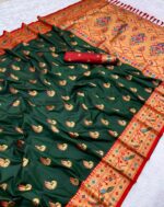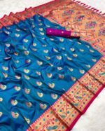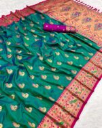 Be the first to review “Rich Pethani Silk Saree with Zari Weaving, Meenakari Peacock Border, and Tassels kgm brand” Cancel reply