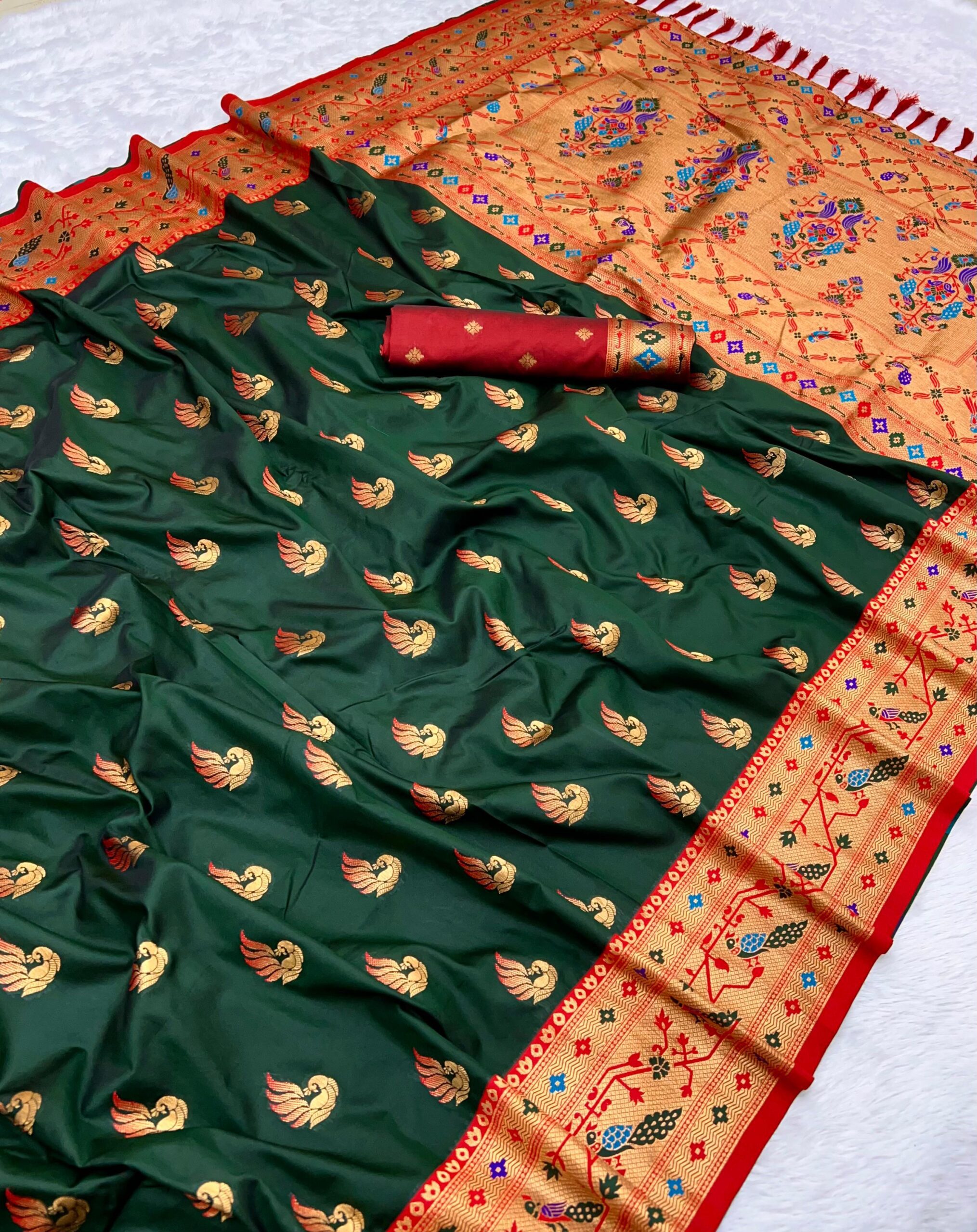 Rich Pethani Silk Saree with Zari Weaving, Meenakari Peacock Border, and Tassels kgm brand