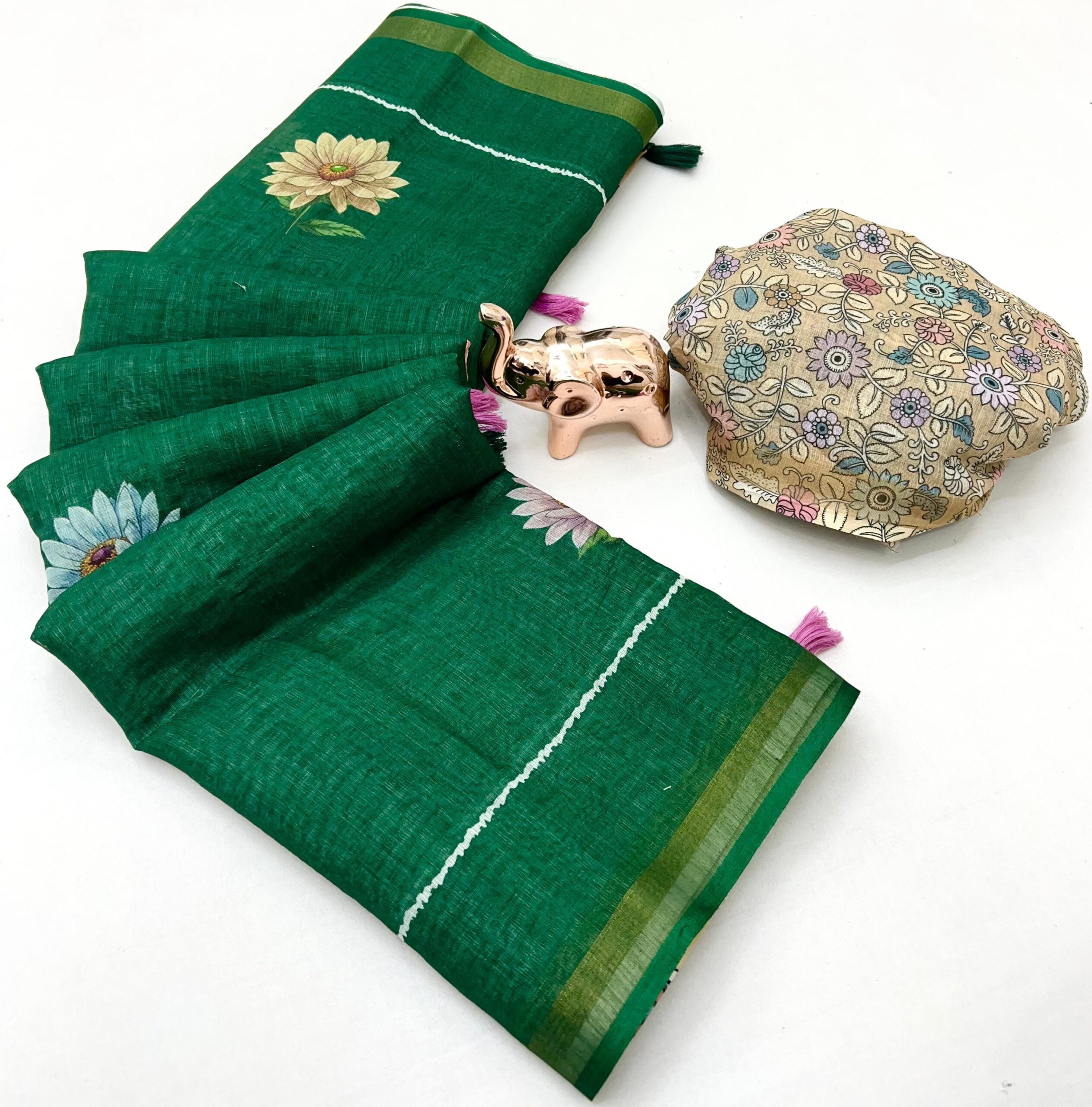 "Designer Printed Soft Linen Saree - Lightweight & Smooth Fabric Collection" kgm brand
