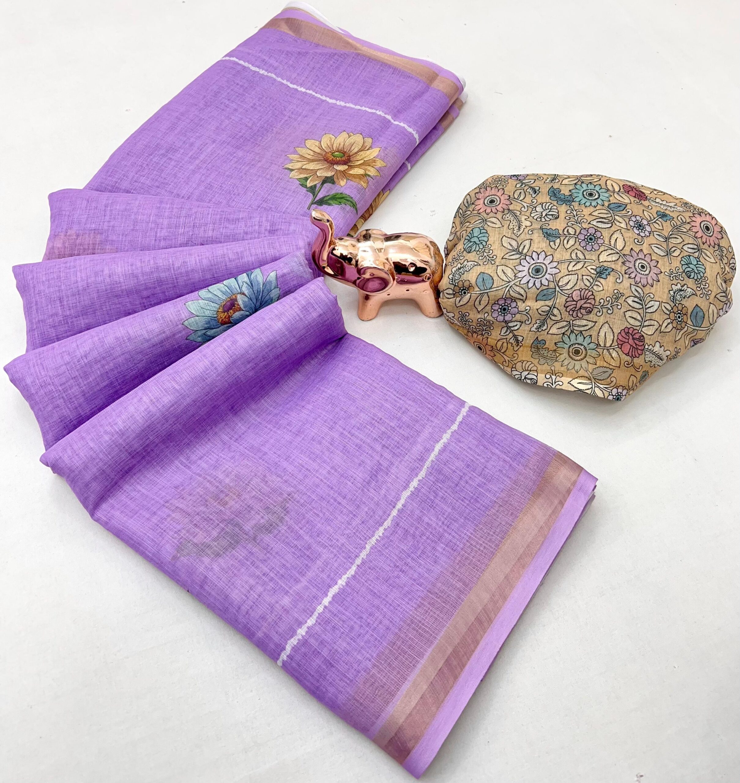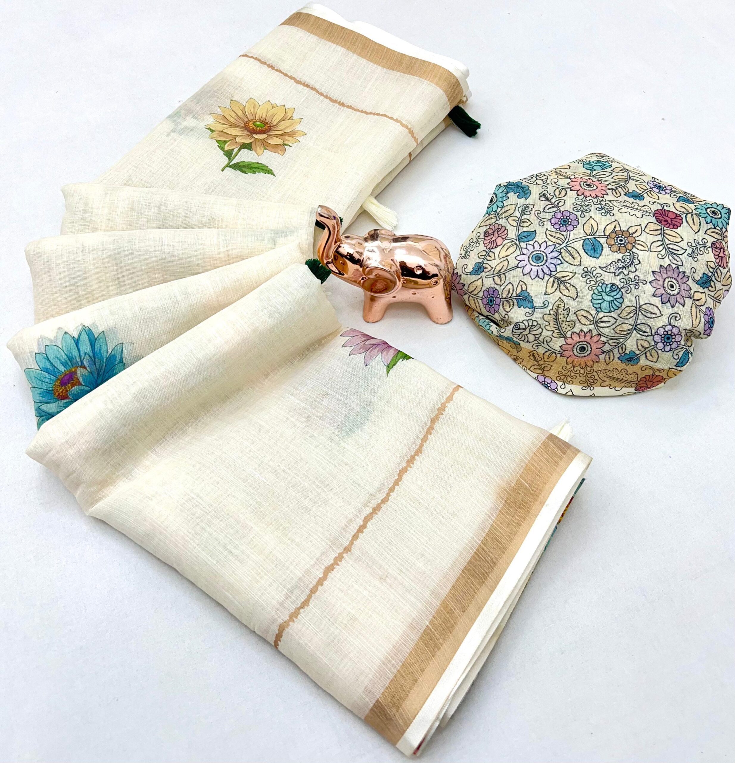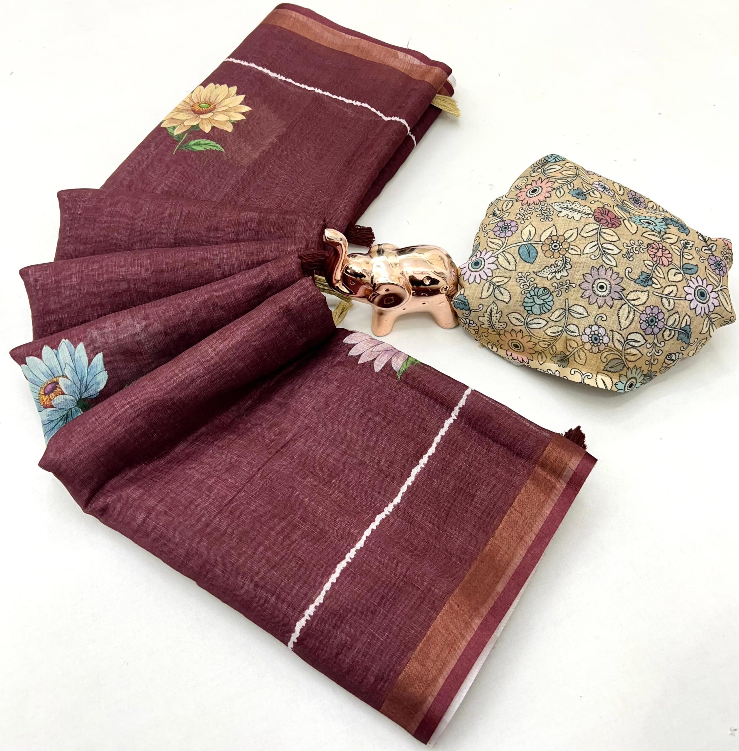 Lightweight soft Linen Saree - Hand-Painted Style Floral Print Pallu & Motifs kgm brand