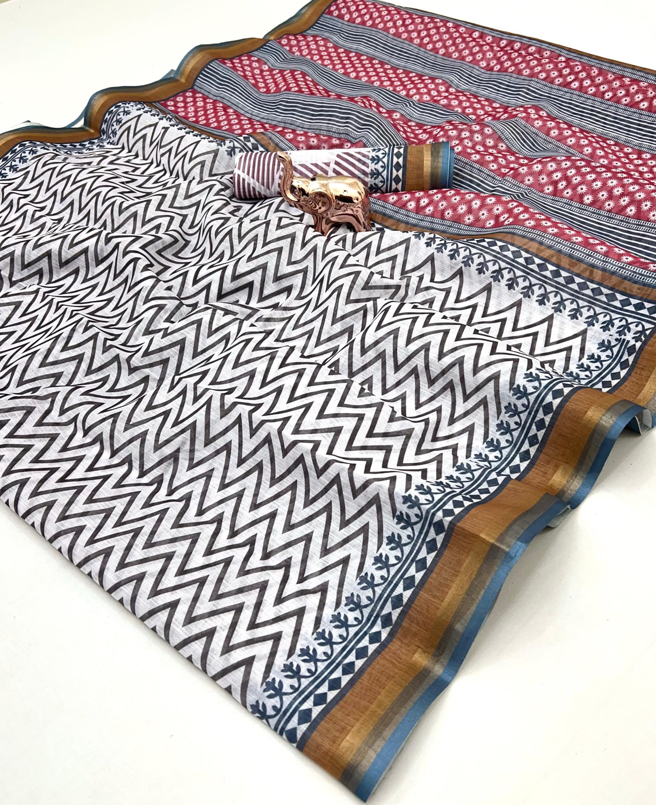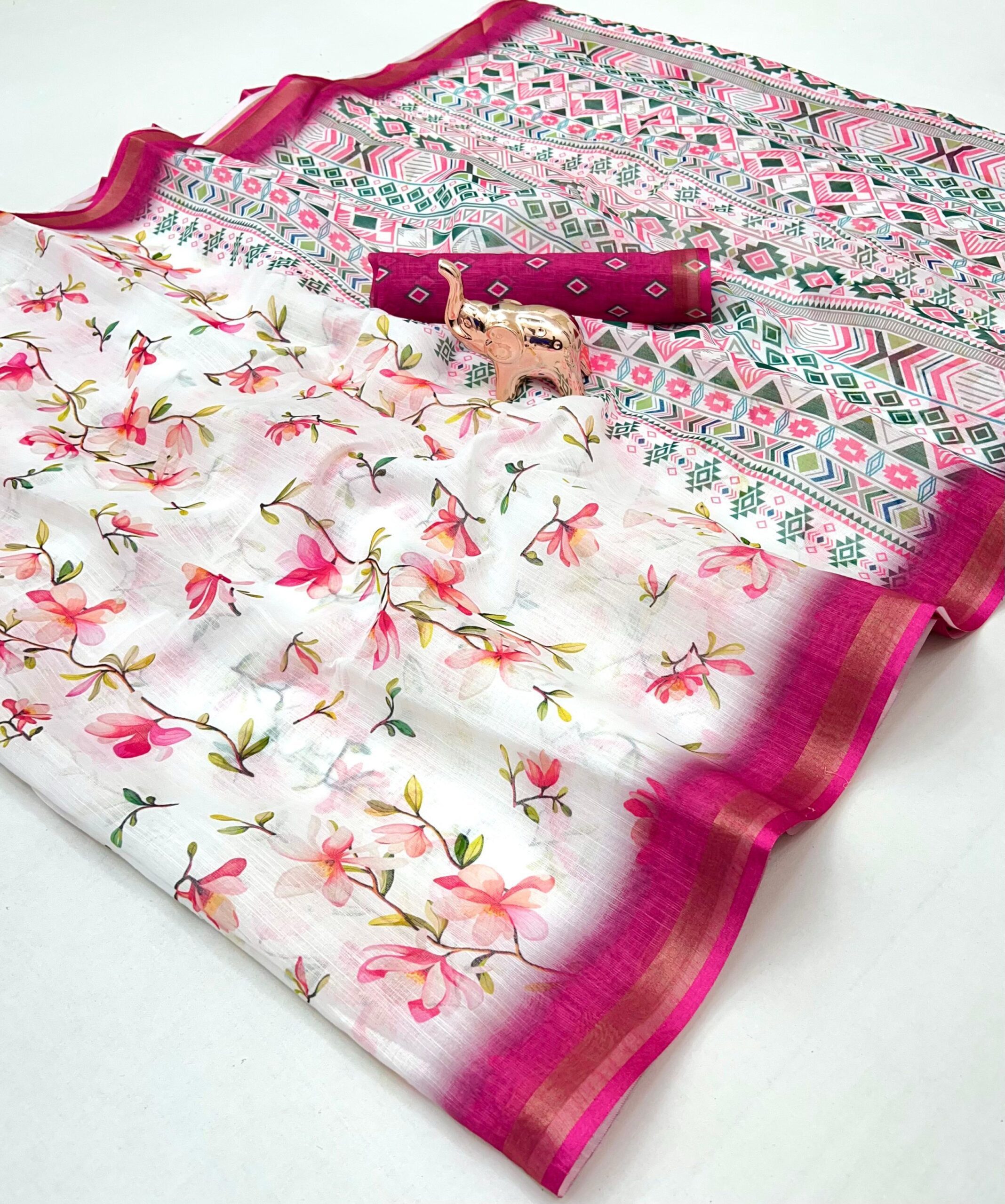 - Saree Body: Features a chic, slightly textured weave enhanced with beautiful floral appliqué or scattered digital motifs.