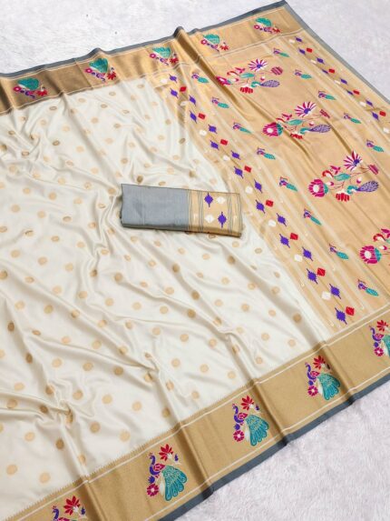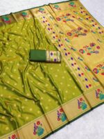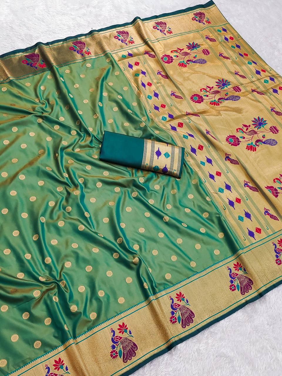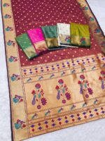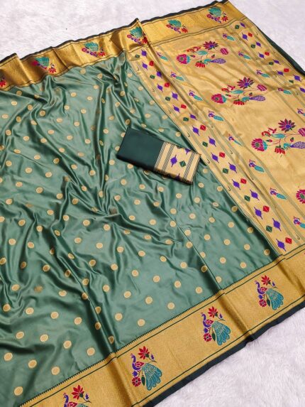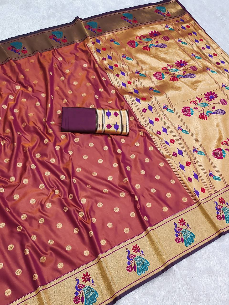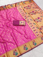 *Saree :-* A Pethani silk saree are woven using silk yarn and embellished with golden zari & Meenakari threads unique Motifs.