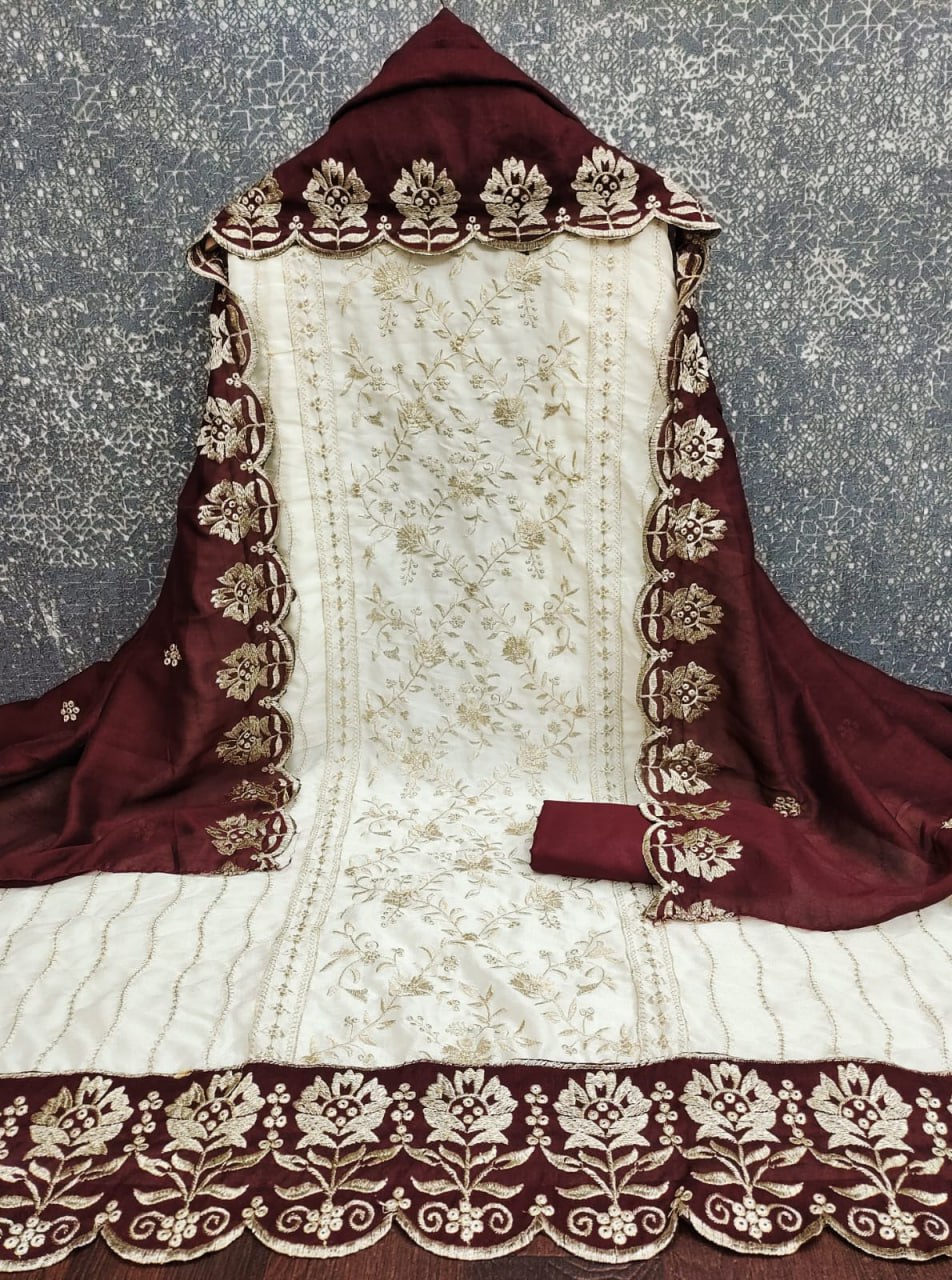 Heavy Zari Work: Intricate gold-toned Zari embroidery covering the entire top and borders.