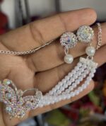 Make a statement with our Butterfly Pearl Choker Set. This eye-catching jewelry set features four rows of lustrous white pearls and a sparkling iridescent butterfly centerpiece that catches the light from every angle.