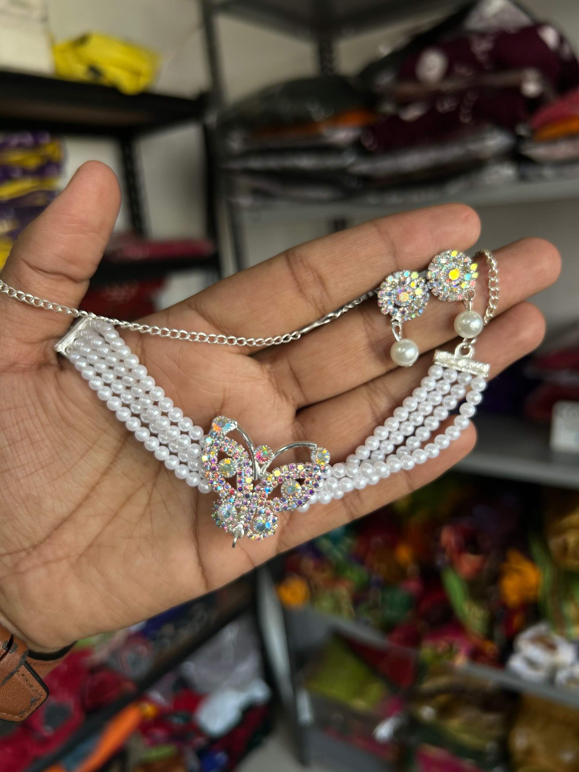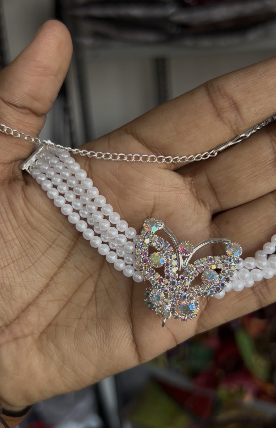 Make a statement with our Butterfly Pearl Choker Set. This eye-catching jewelry set features four rows of lustrous white pearls and a sparkling iridescent butterfly centerpiece that catches the light from every angle.