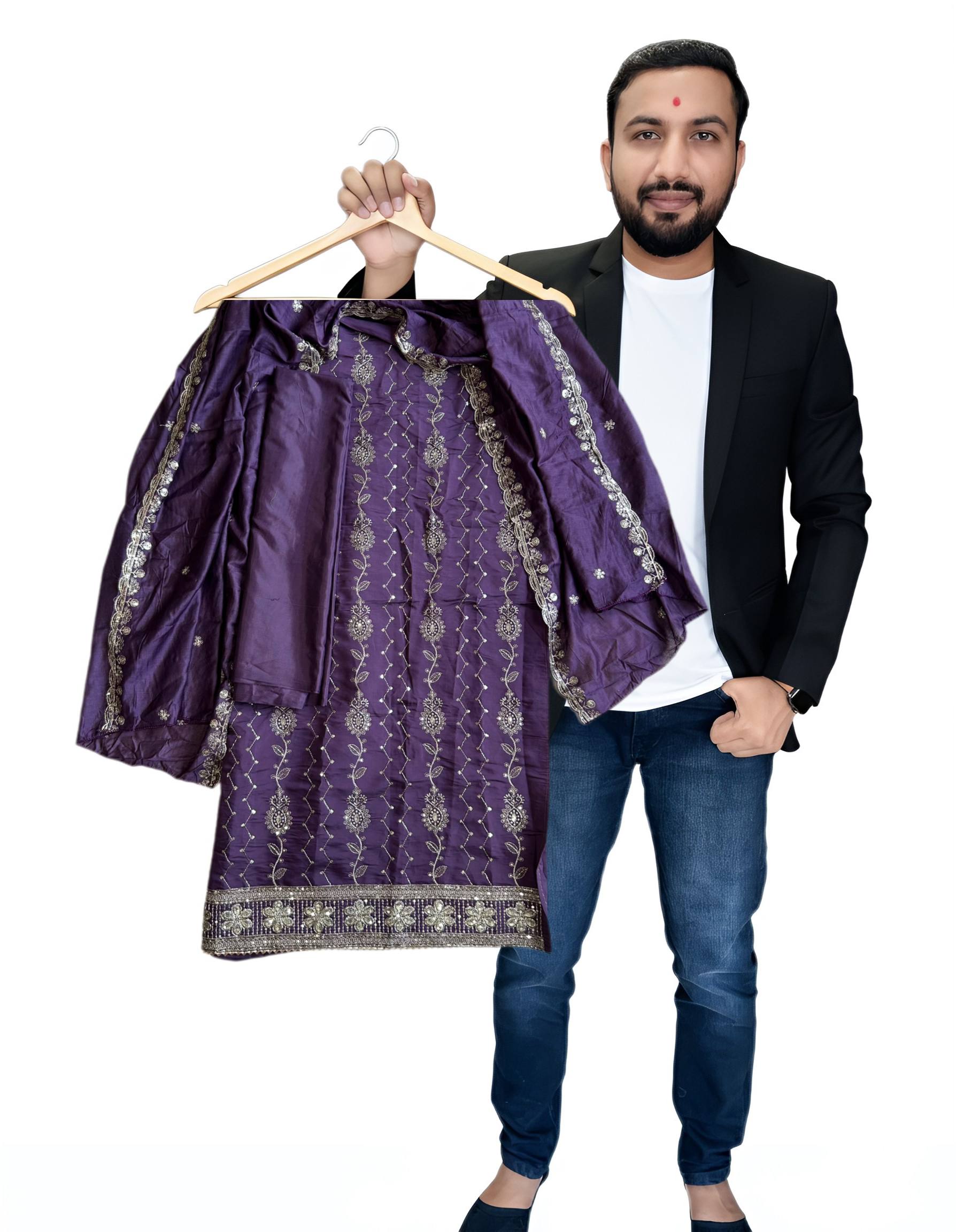 Be the first to review “Women’s Roman Silk Unstitched Salwar Suit Dress Material with Hand Work, Heavy Santoon Bottom, and Chanderi Dupatta kgm brand” Cancel reply
