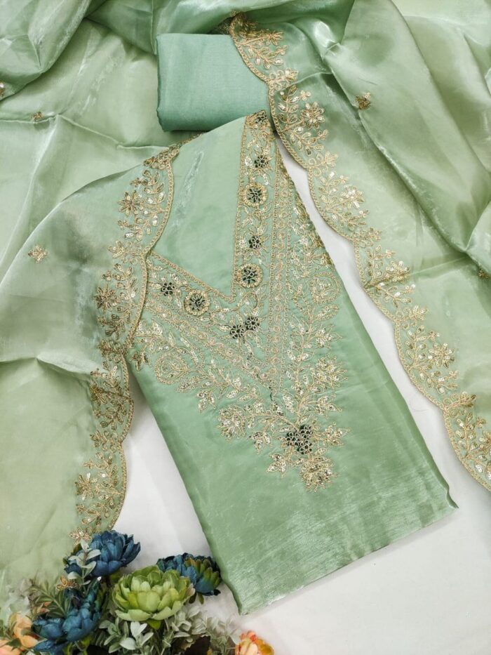 Georgette Unstitched Dress Materials with Embroidery Work For Women’s yellow maroon green – GREEN