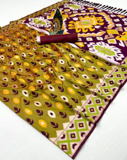 Banarasi Zari Woven Soft Silk Saree with Meenakari Ikkat Design & Contrast Blouse kgm brand