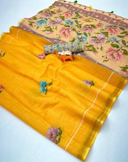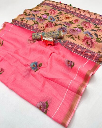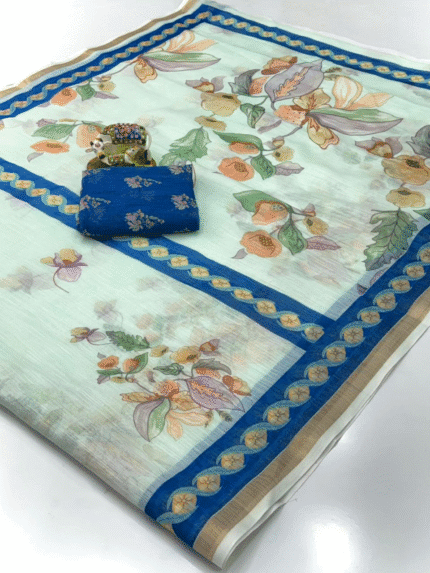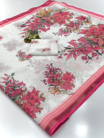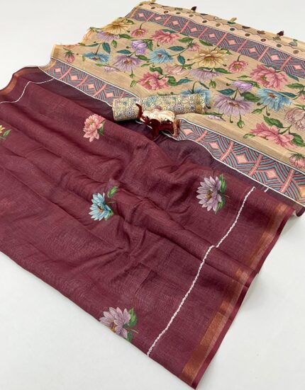 Lightweight soft Linen Saree – Hand-Painted Style Floral Print Pallu & Motifs kgm brand