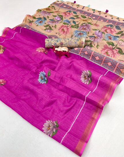 Soft Linen Saree with Digital Floral Kalamkari Pallu & Applique kgm brand